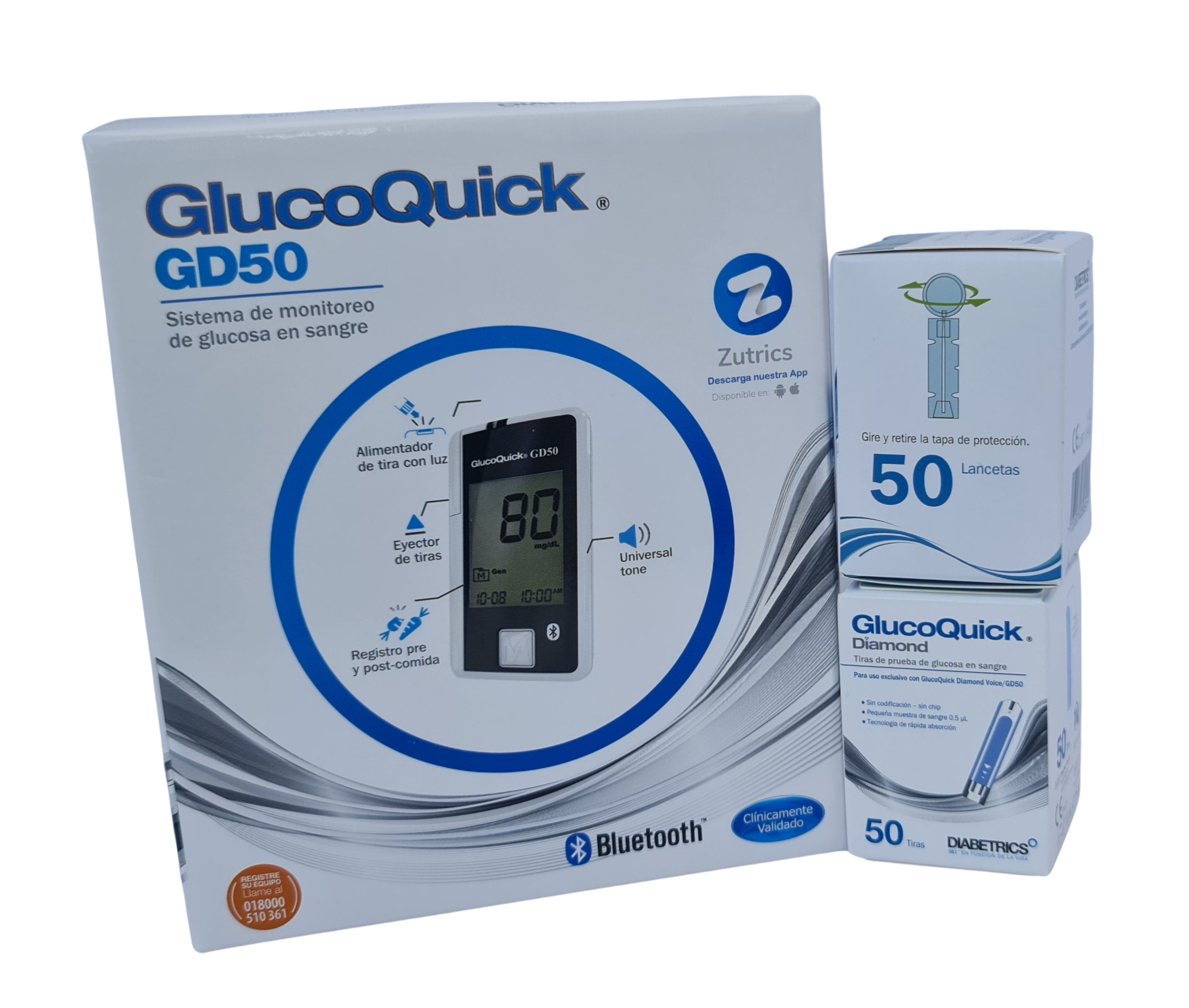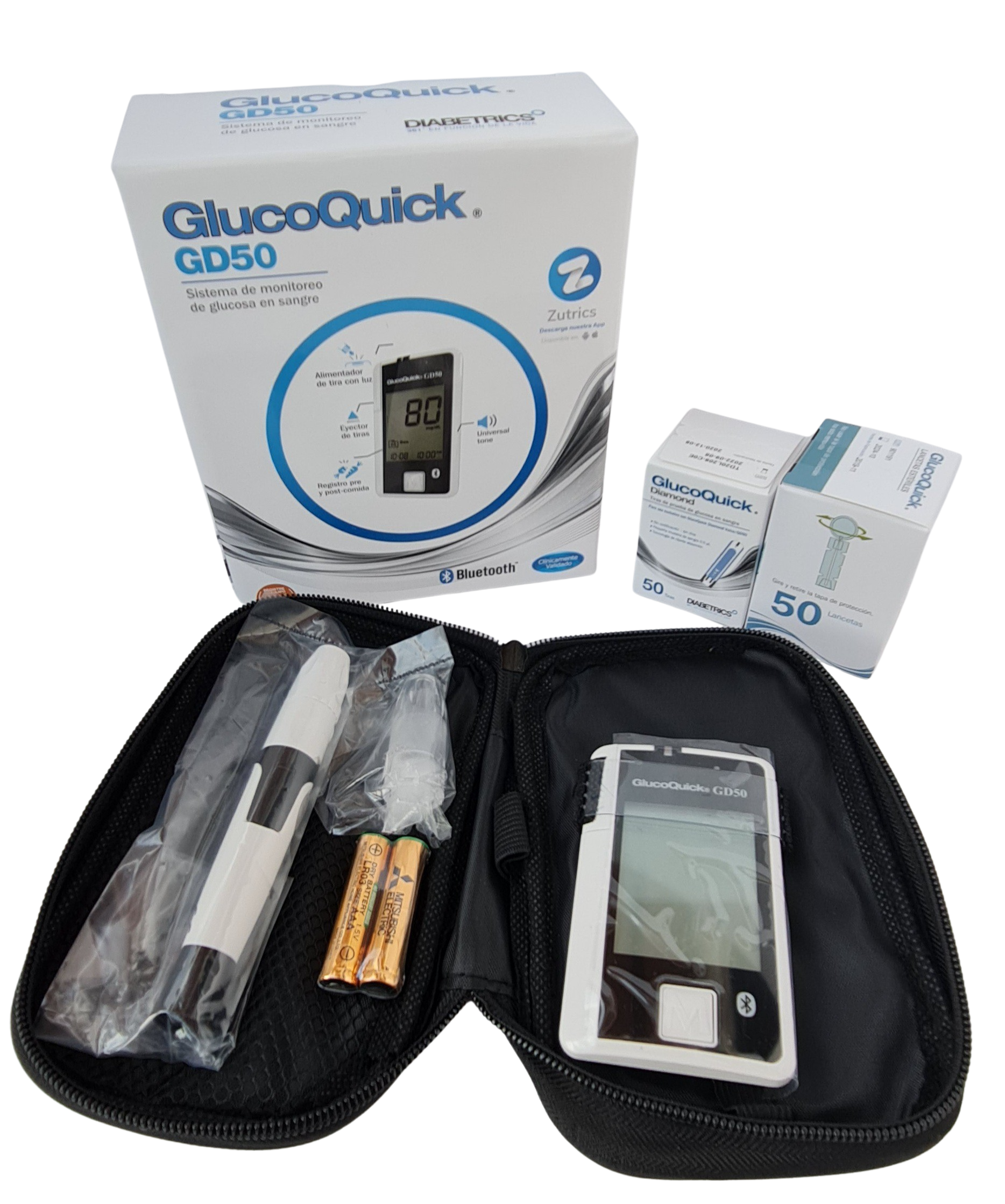 El kit de monitoreo de glucosa GlucoQuick Diamond GD50 es un sistema digital compacto, rápido y preciso, ideal para el autocontrol de la diabetes. Incluye Bluetooth para gestión de datos, tecnología sin codificación, pantalla LCD retroiluminada y resultados en 5 segundos usando solo 0,5 U/L de sangre.