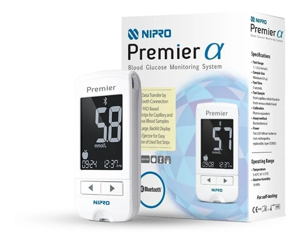 El kit Nipro Premier Alpha es un sistema de monitoreo de glucosa en sangre de alta tecnología, compacto y portátil, diseñado para un control rápido (5 segundos) y preciso. Destaca por su conectividad Bluetooth a la app SmartLog, medición con pequeña muestra . memoria de 1,000 resultados y tecnología sin codificación