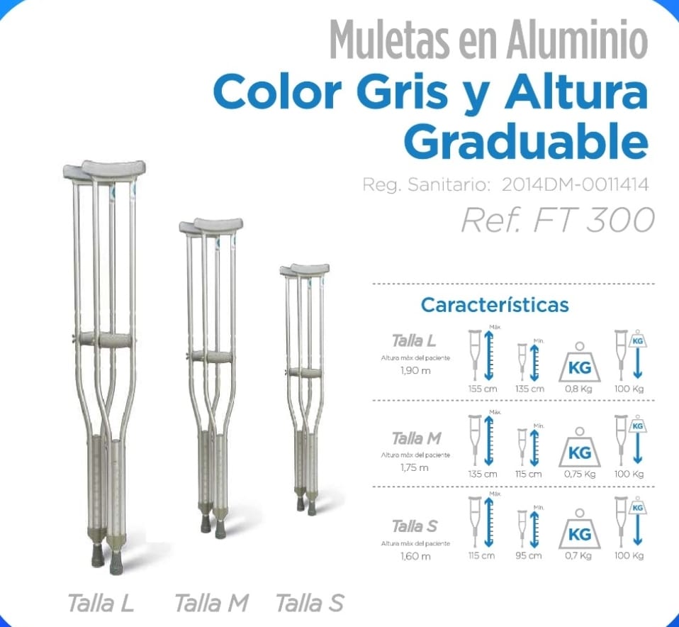Fabricadas en aluminio ligero de color gris, estas muletas son resistentes y fáciles de manejar, lo que reduce la fatiga del usuario durante su uso prolongado. Incorporan un sistema de ajuste de altura en la parte inferior, permitiendo adaptarlas a la estatura de cada persona para asegurar una postura ergonómica y cómoda.