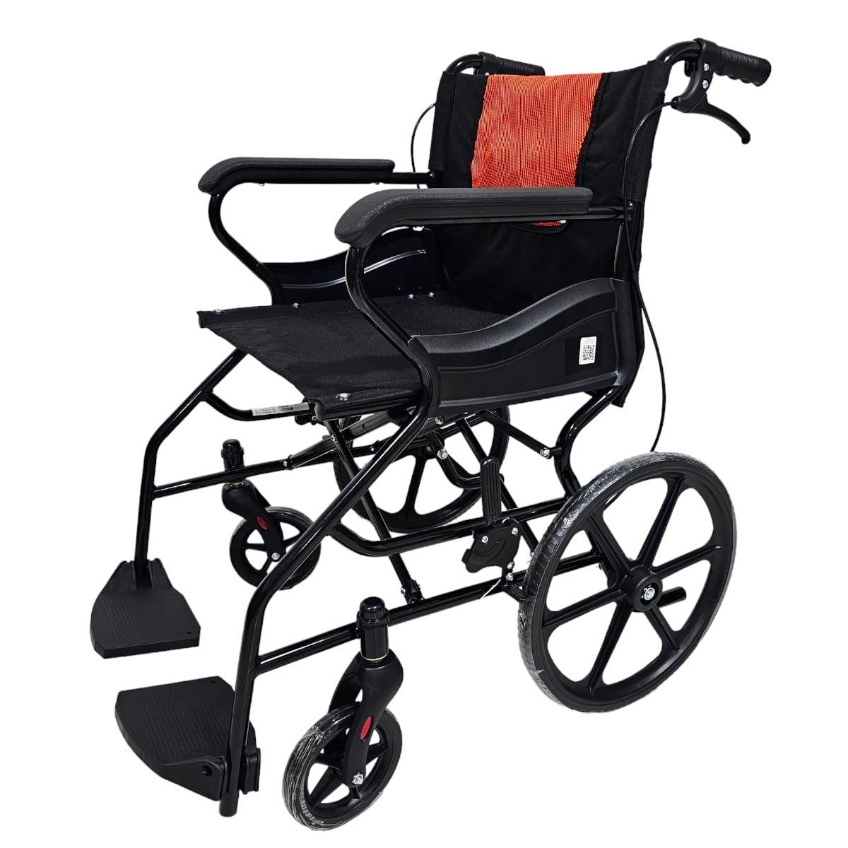 La silla KBE-9125T es una solución de movilidad diseñada específicamente para el traslado seguro y cómodo de pacientes en interiores. Su estructura en acero pintado de color negro combina una alta resistencia con un diseño funcional de «doble tijera» que facilita un plegado compacto para su almacenamiento o transporte.