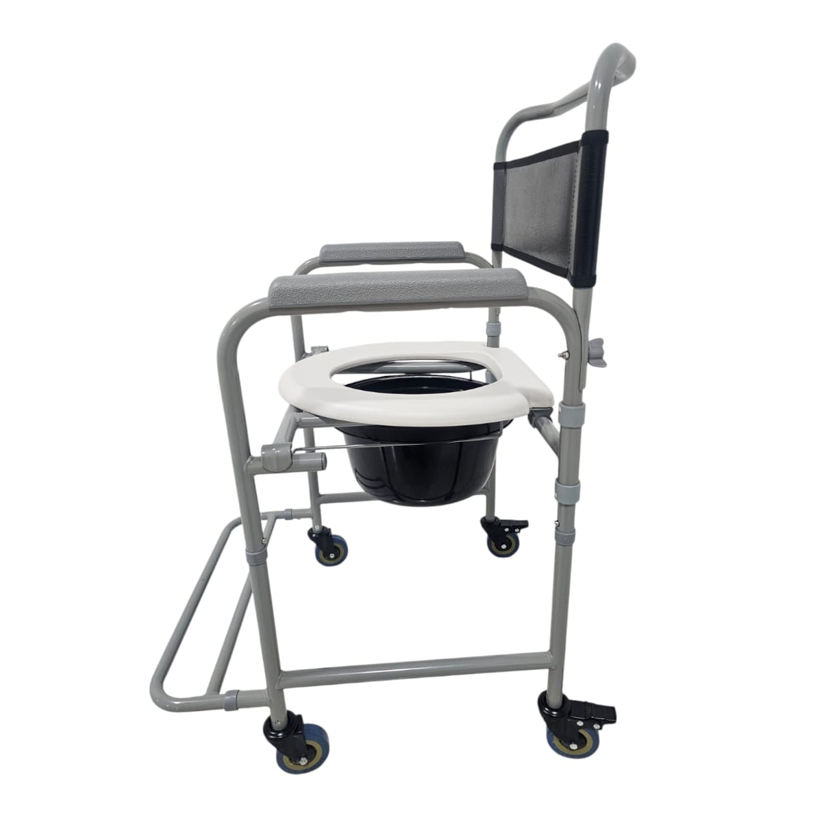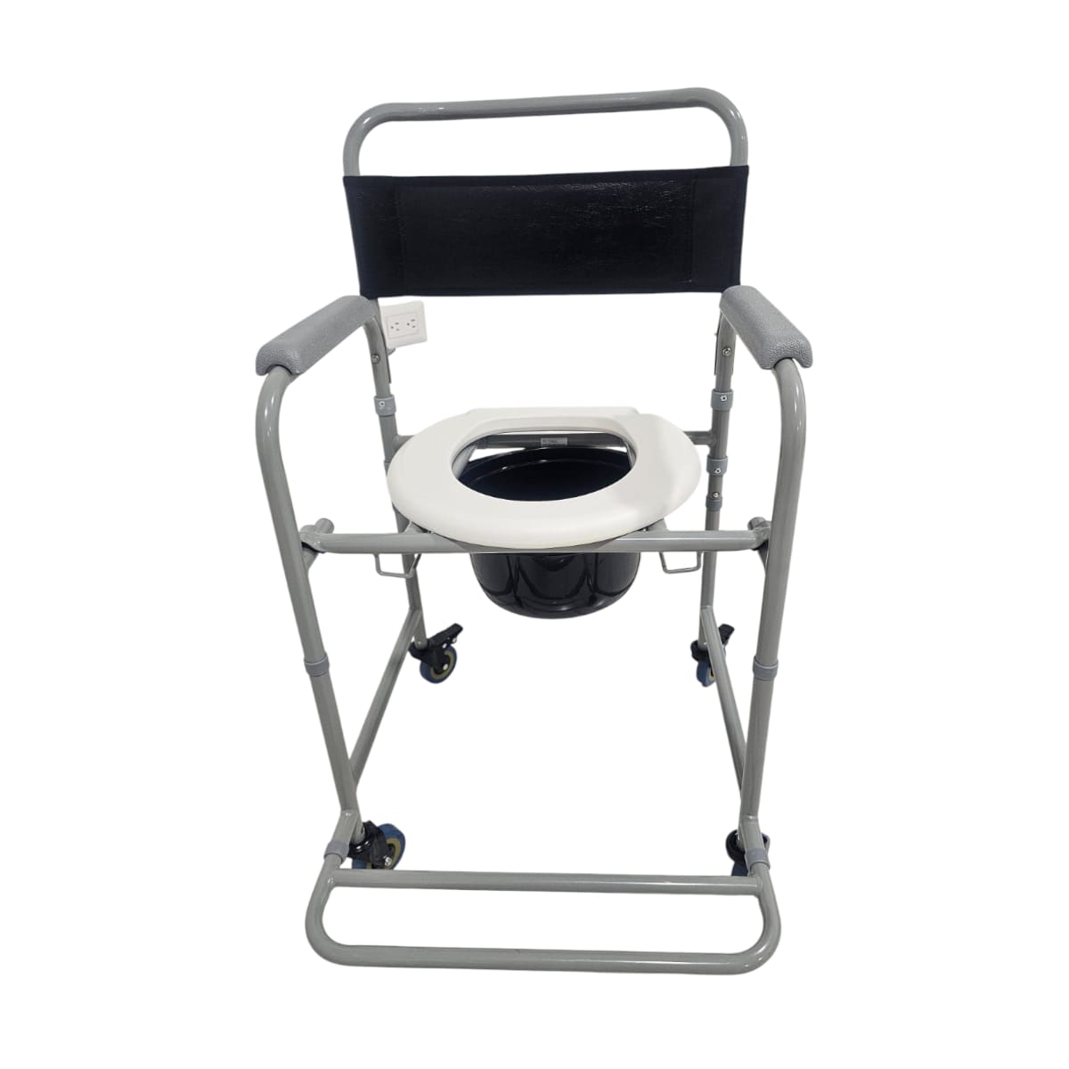 Sistema de Movilidad Segura: Equipada con ruedas de 3 pulgadas que permiten traslados suaves dentro del hogar. Incluye frenos de seguridad en las ruedas traseras para inmovilizar la silla durante el uso sanitario o las transferencias.